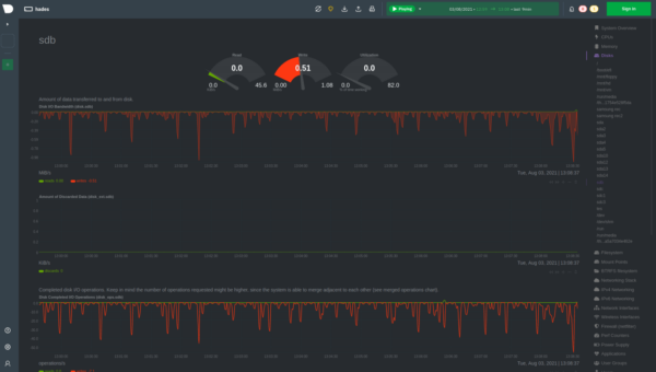 Netdata monitors all your Disks by offering many charts out-of-the-box on ready-made dashboards. This data includes, but is not limited to: