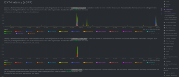- Disk Latency (eBPF): Latency chart showing histogram with the time necessary for read and write data.