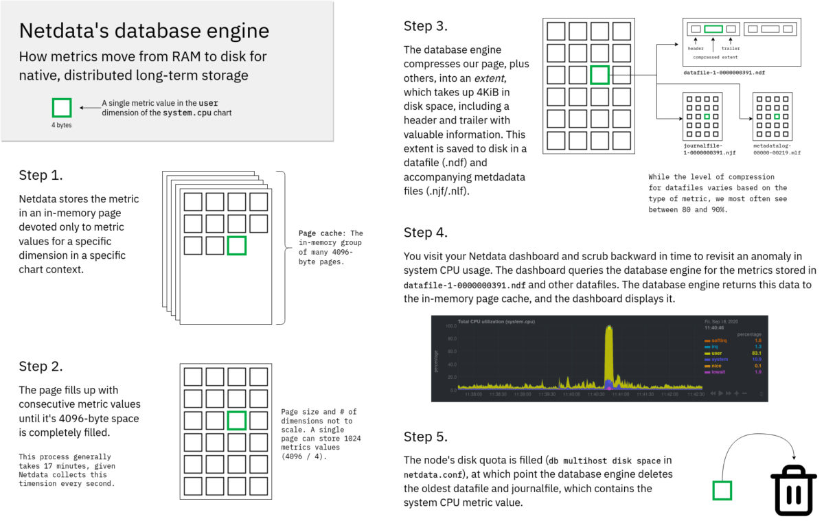 The database engine is a time-series database with a few twists to make it ideal for distributed, scalable, long-term storage of highly granular metrics.When the Netdata Agent collects metrics from its system, it stores the most chart metric values in memory. Each dimension gets its own 4096-byte page, with Netdata’s many collectors continuing to fill these pages with consecutive values. These pages are the page cache.