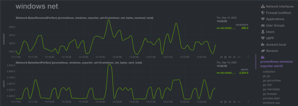 For example, here’s some raw Prometheus metrics for bytes received and sent on a Windows system: