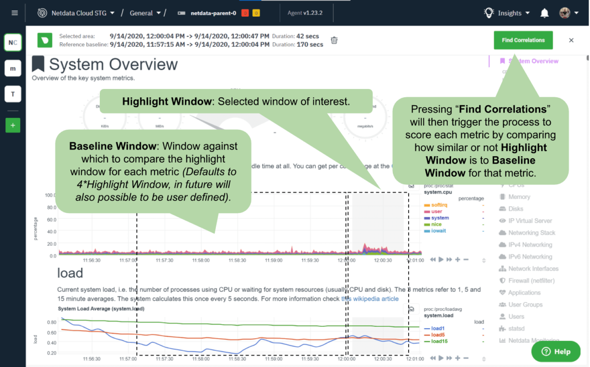 In this vein, it is fitting that the default approach of our first release of the Metric Correlations feature uses a well established statistical method to surface charts that might be of interest given a specific window of focus you select.The use case is this: You see something strange on some chart you are looking at somewhere in Netdata Cloud and would like to identify and analyze the affected metrics and more importantly, the metrics that will lead you to pinpoint a potential root cause. Go to Insights > Metric Correlations, highlight the area of interest, and click the Find Correlations button.