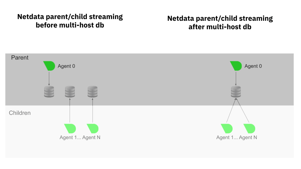 In our new, multi-host database mode, parent and child nodes share resources in a single instance. Any pre-existing child node metrics remain in the legacy dbengine paths to ensure backward compatibility. To migrate those nodes to the new multi-host database, simply delete those metric cache paths. This new mode supports distributed queries for the Agent as well as specific scenarios like streaming metrics from the child to parent database, streaming multiple child nodes to a single parent, and remembering which child or children are connected to the database even if streaming hasn’t started.