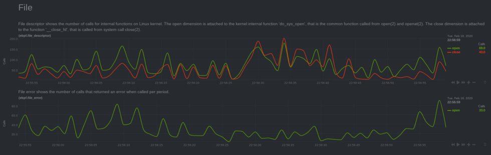 Thanks to the new eBPF collector released in v1.20 of Netdata, you now have access to this superpower!To enable eBPF metrics collection, we wrote two custom eBPF programs for Netdata. The default, called entry, monitors calls to a variety of kernel functions, such as do_sys_open, __close_fd, vfs_read, vfs_write, _do_fork, and more. The return program also monitors the return of each kernel functions (aka errors) to give even more visibility into your system.