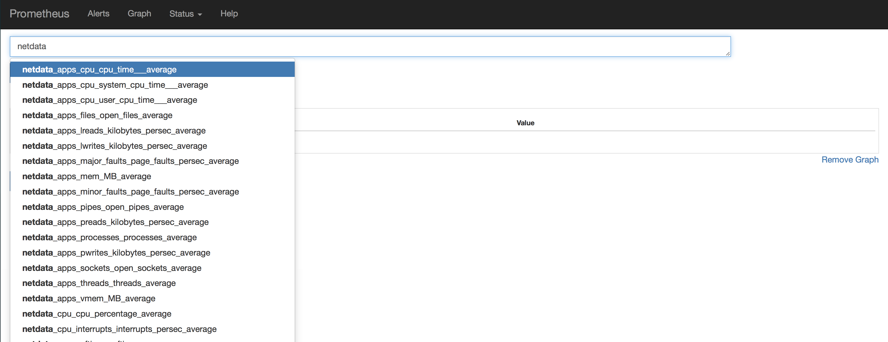 Prometheus’s homepage and begin to type netdata\_ Prometheus should auto complete metrics it is now scraping.