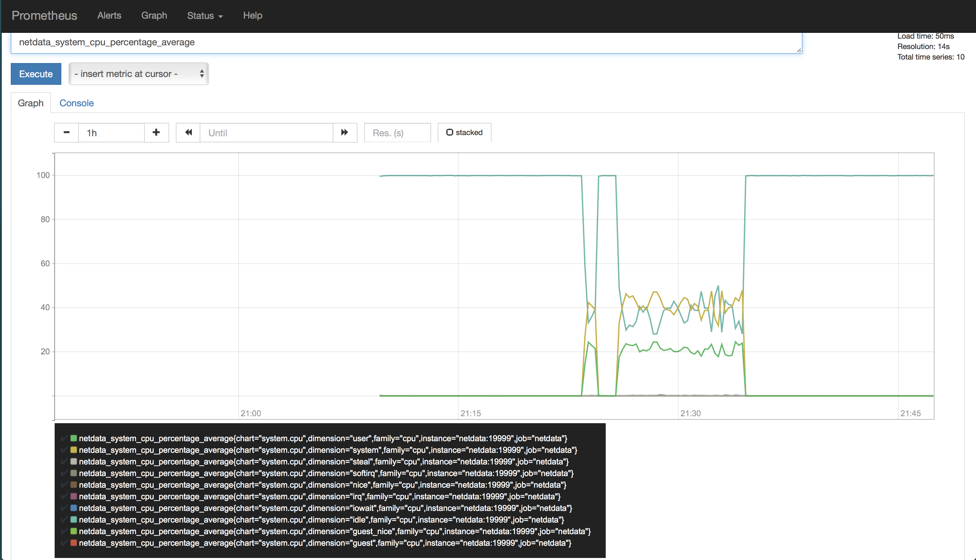 Let’s give this a try: netdata_system_cpu_percentage_average{chart="system.cpu", instance="netdata:19999"}