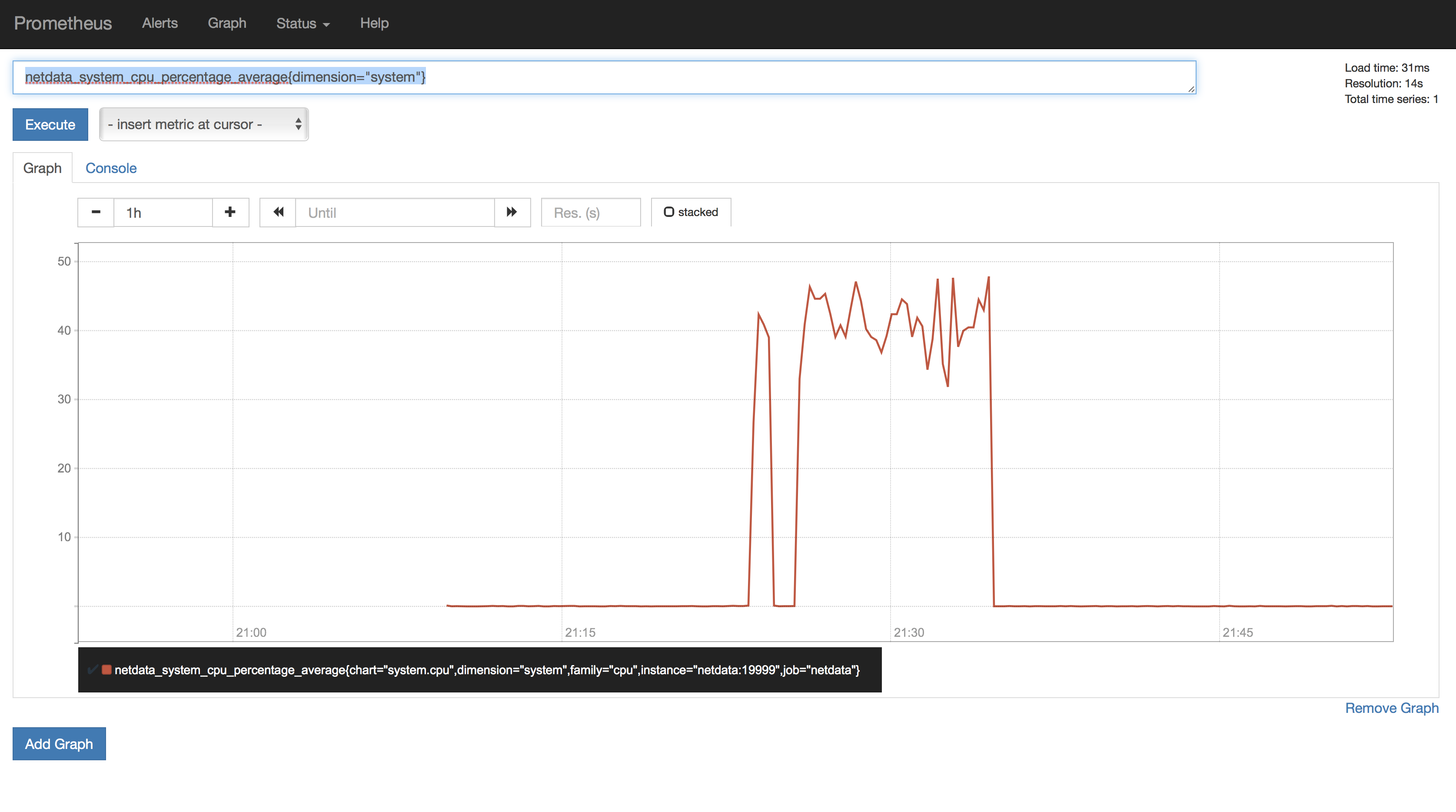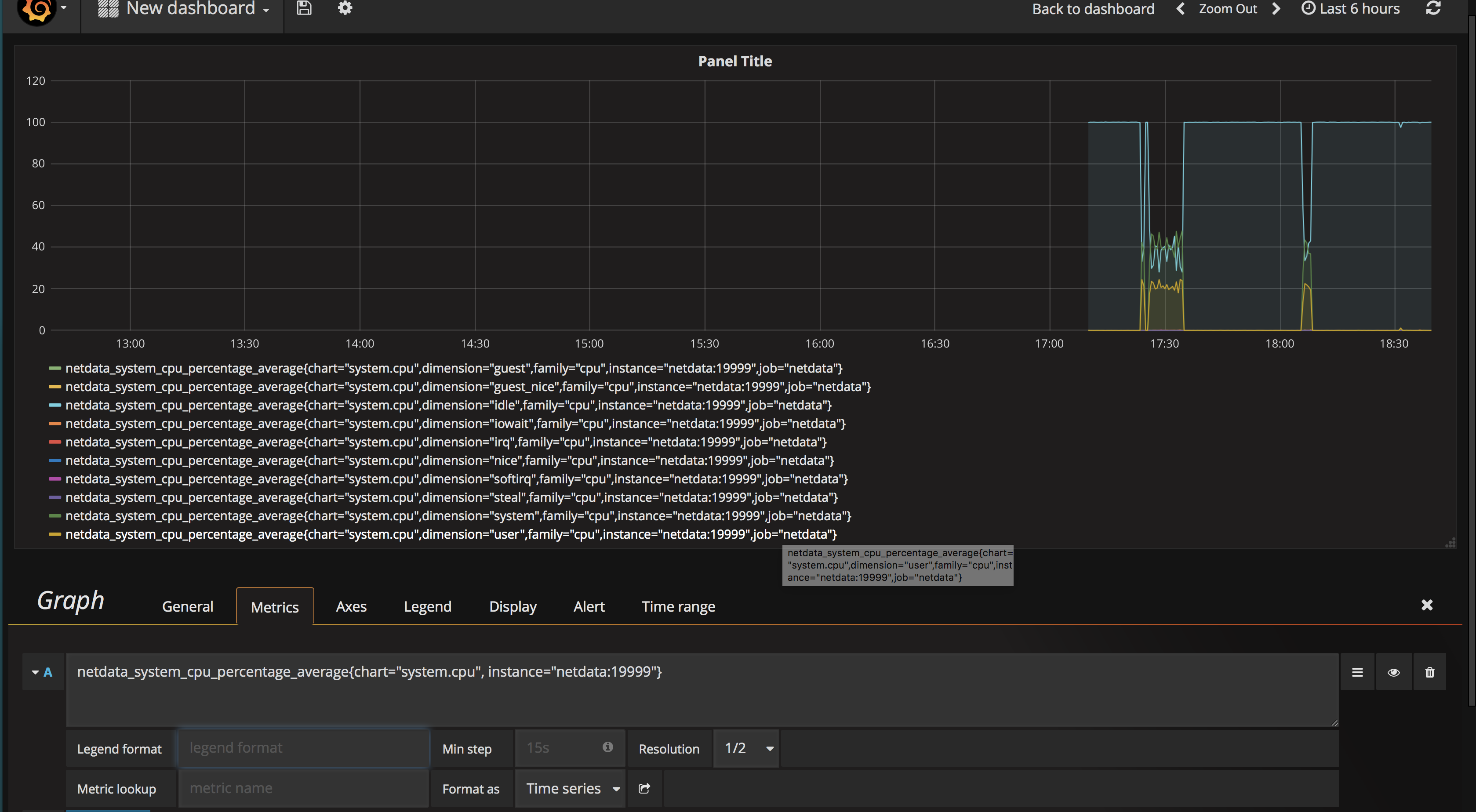 netdata_system_cpu_percentage_average{dimension="system"} We now wind up with the following graph.