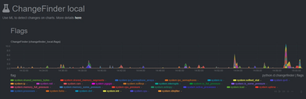 The changefinder collector returns a changepoint score for every chart or dimension you configure it to monitor, and it evolves over time as new metrics roll in. Because there’s no batch training, this type of machine learning is scalable—ideal for situations where you need to monitor lots of charts, or have many child nodes all streaming their metrics to a single parent to do all the heavy ML lifting.