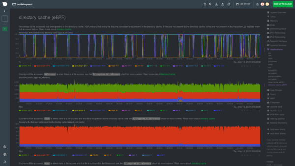 Restart Netdata with sudo systemctl restart netdata and refresh the dashboard to launch the new directory cache collector. You’ll find these charts in the Applications section, under the submenu directory cache (eBPF).