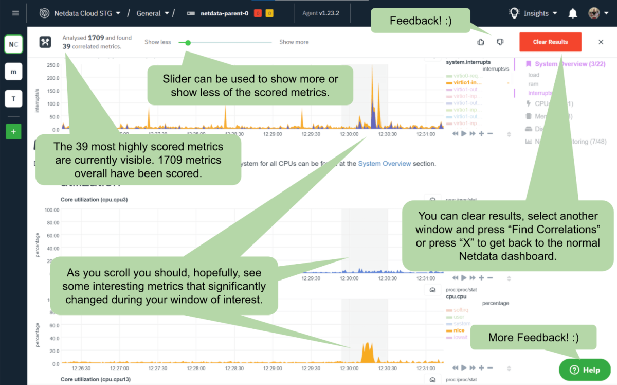 Feedback on the features we introduce is crucial for our plans to refine and improve, as well as decide where else to focus our efforts for new or related ideas. If you are using this feature and feel strongly enough to provide any sort of feedback, positive or negative, you can use the thumbs up or down button or the Help widget on the bottom right if you’d like to give more detailed feedback as shown in the diagram above.Feel free to also reach out to us on the Netdata Community forums; we’d be happy to chat more and learn what other features you might be interested in seeing added to our roadmap.
