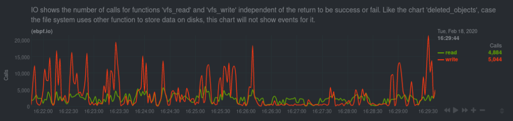 Having real-time eBPF metrics on hand can help guide you to the next stage in troubleshooting anomalies with your applications and services. For example, theebpf.io chart shows the volume of calls to the vfs_read function. Is that number is suspiciously high all of a sudden? Maybe it’s to move to the command line.